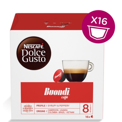 Descubra NESCAFÉ® Dolce Gusto® BUONDI®. Um espresso com carácter, inspirado nos cafés portugueses. Um blend rico e intenso de 3 continentes, selecionado a partir de uma combinação dos quentes Robustas Africanas com o corpo das Robustas do Vietname e os aromas frutados das Arábicas da Colômbia. Um expresso com creme dourado envolto num corpo aveludado, com aromas ricos da groselha negra e notas apimentadas.